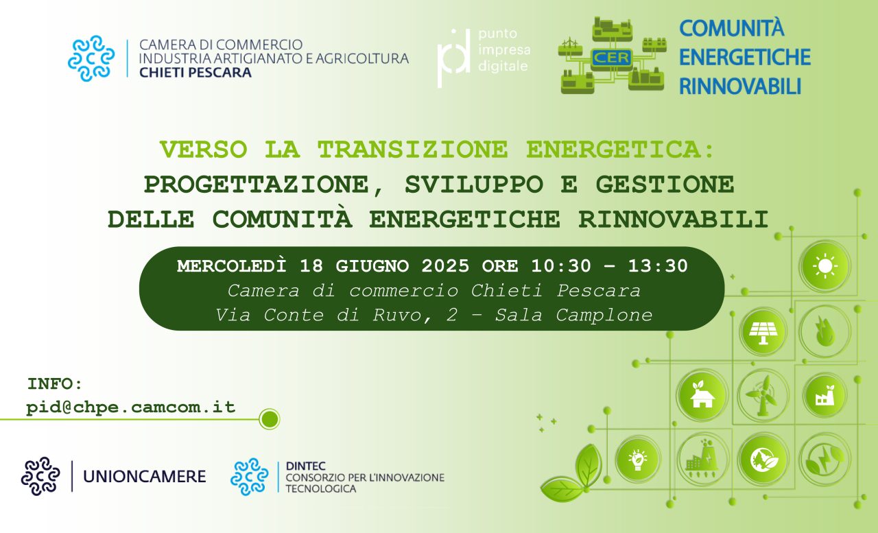 Il prossimo 18 giugno presso la Camera di Commercio di Chieti-Pescara in Via conte di Ruvo 2, Sala Camplone, si terrà il seminario dedicato alle Comunità Energetiche Rinnovabili (CER).